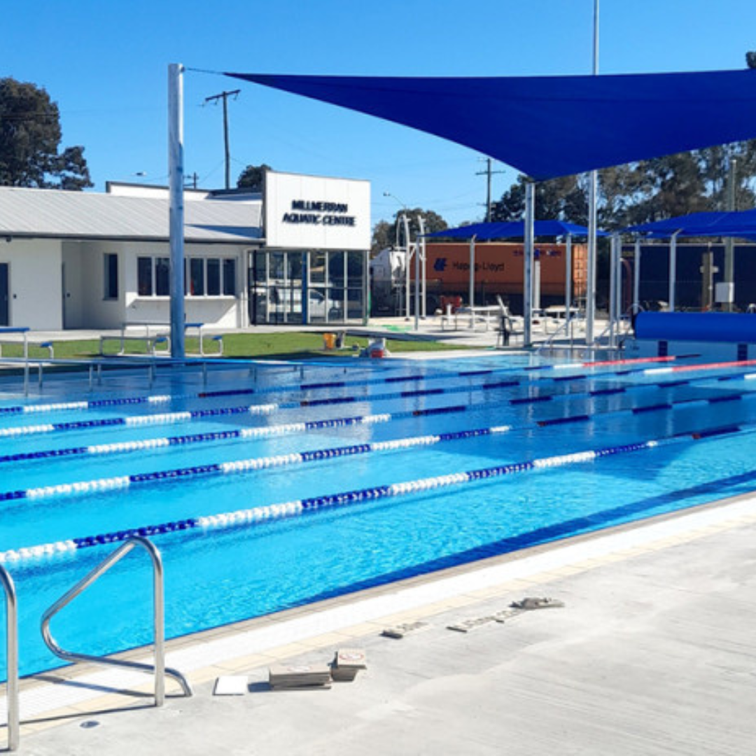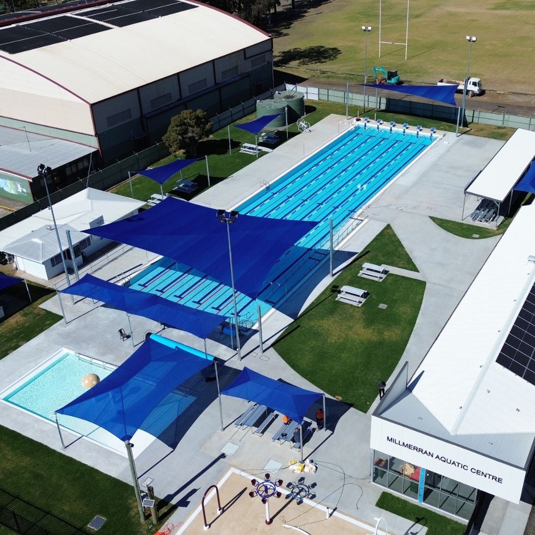 The Millmerran Aquatic Centre has recently undergone a full refurbishment and now offers the Millmerran and surrounding community a new 50-metre pool and improvements to existing facilities including a new kiosk building, change rooms, covered grandstand, improved shade areas, pool heating and an access ramp to the 50m pool!